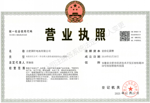 合肥国轩电池有限公司成立于2018年03月30日,注册地位于安徽省合肥市经济技术开发区宿松路3959号恒创智能科技园。经营范围包括锂离子电池生产,太阳能、风能可再生能源产品及设备、节能型光电产品、电子产品、锂电电源、电动工具、锂电充电器的研发、生产、销售及租赁(以上项目危险品除外),新能源技术开发,货物及技术进出口(国家法律法规禁止的项目除外,国家法律法规限制的项目取得许可后方可经营)。(依法须经批准的项目,经相关部门批准后方可开展经营活动)。(依法须经批准的项目,经相关部门批准后方可开展经营活动)