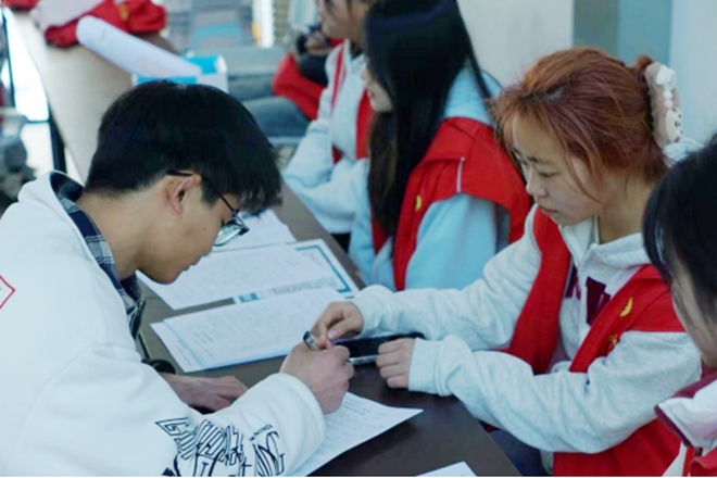 活动当天,志愿者团队身着统一红色马甲,积极协助血站工作人员布置活动功能场区,引导每一位献血者填写健康征询表,耐心安抚献血同学的情绪,确保了活动有序、高效进行。