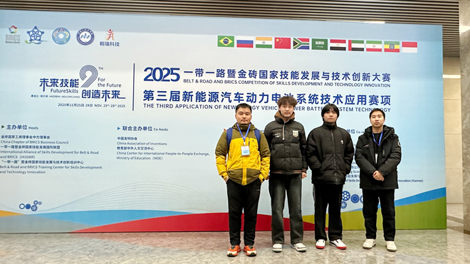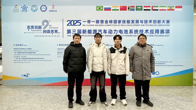 近日,2025一带一路暨金砖国家技能发展与技术创新大赛第三届新能源汽车动力电池系统技术应用赛项在黑龙江落幕。本次赛事聚焦新能源汽车核心技术领域,吸引全国范围内38支学生参赛队、29支教师参赛队同台竞技。安徽汽车职业技术学院参赛队伍凭借扎实的专业功底、娴熟的实操技能和默契的团队协作荣获教师组一等奖、高职学生组二等奖、中职学生组三等奖各1项。