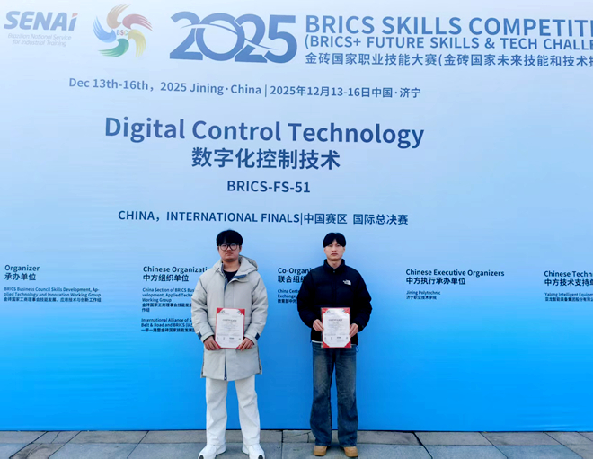 12月16日,2025年金砖国家职业技能大赛——数字化控制技术赛项国际总决赛落下帷幕。安徽汽车职业技术学院学生取得佳绩,李轩、陈坤两位同学荣获国际总决赛三等奖。