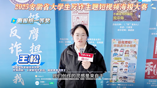 1月9日,由安徽省通信管理局、安徽省公安厅、安徽省教育厅、共青团安徽省委员会、安徽省学生联合会主办的“2025年安徽省大学生反诈主题短视频海报大赛”颁奖仪式在合肥市举行。由安徽汽车职业技术学院报送的海报作品《掌握反诈密码,解锁青春无诈》荣获一等奖。