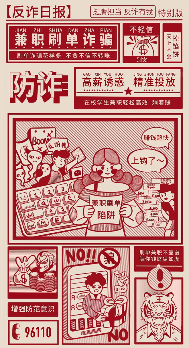 《掌握反诈密码,解锁青春无诈》创作灵感来源于学校的反诈宣传,以及生活中发生较高的诈骗案件,以插画的形式让反诈宣传通俗易懂。