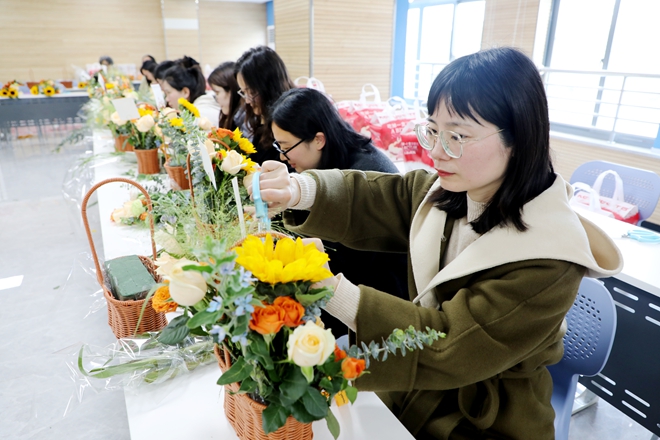 3月6日,紫云校区内花香四溢、笑语盈盈,学校妇联在此举办“芳华绽放 指尖生花”主题花艺插花活动,成为本次“三八”节系列活动的重头戏。
