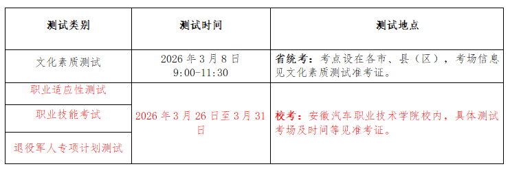 主要考核考生未来从事生产、建设、服务、管理等一线工作所必备的基本职业素质,主要包括思想道德素质、科学和创新素养、应用分析能力三个模块。测试方式为现场笔试,总分300分,测试时间90分钟。具体内容详见我校官网公布的《安徽汽车职业技术学院 2026年分类考试招生职业适应性测试纲要》。