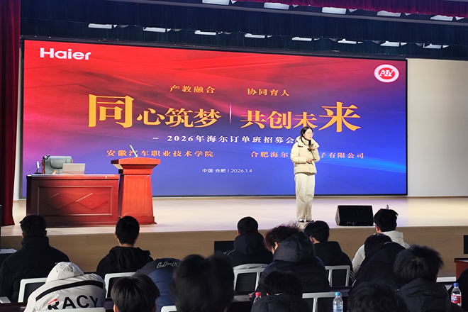 1月4日,学校联合合肥海尔在莲花校区举办海尔订单班校园宣讲会,共计300余名学生参加了宣讲会。