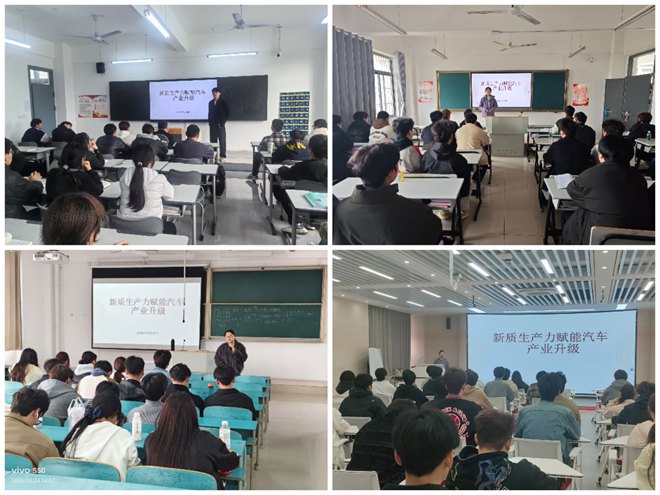 为深入推进党的创新理论进教材、进课堂、进头脑,近日,马克思主义学院思政教研室举办了4场“新质生产力赋能汽车产业升级”的专题讲座。胡月、姜曼、左小静、张培培四位思政教师担任主讲,面向学校四个专业系部,覆盖学生200余名。