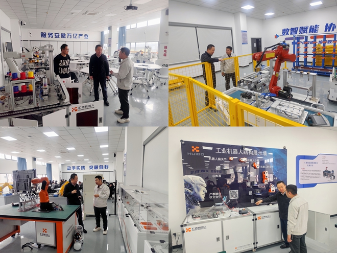 来宾重点参观了综合实训室,该实训室建有工业机器人汽车应用智能产线,集成数字孪生、MES等先进技术,涵盖汽车涂胶、车身装配等典型应用场景。来宾对我校紧贴产业需求、注重动手实践的教学模式给予高度评价。